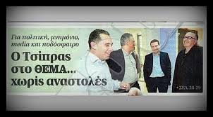 Προαλειφόμενος για πρωθυπουργός, έχει πάρει σβάρνα τα συγκροτήματα του τύπου ο Τσίπρας. Γευματίζει με τον Μπόμπολα, επισκέπτεται τον ΔΟΛ και γευματίζει με τον Ψυχάρη, συναντιέται με το επιτελείο της ΚΑΘΗΜΕΡΙΝΗΣ και του ΣΚΑΪ, «στο πλαίσιο των συναντήσεών του με ιδιοκτήτες, εκδότες, και διευθυντικά στελέχη εφημερίδων».
